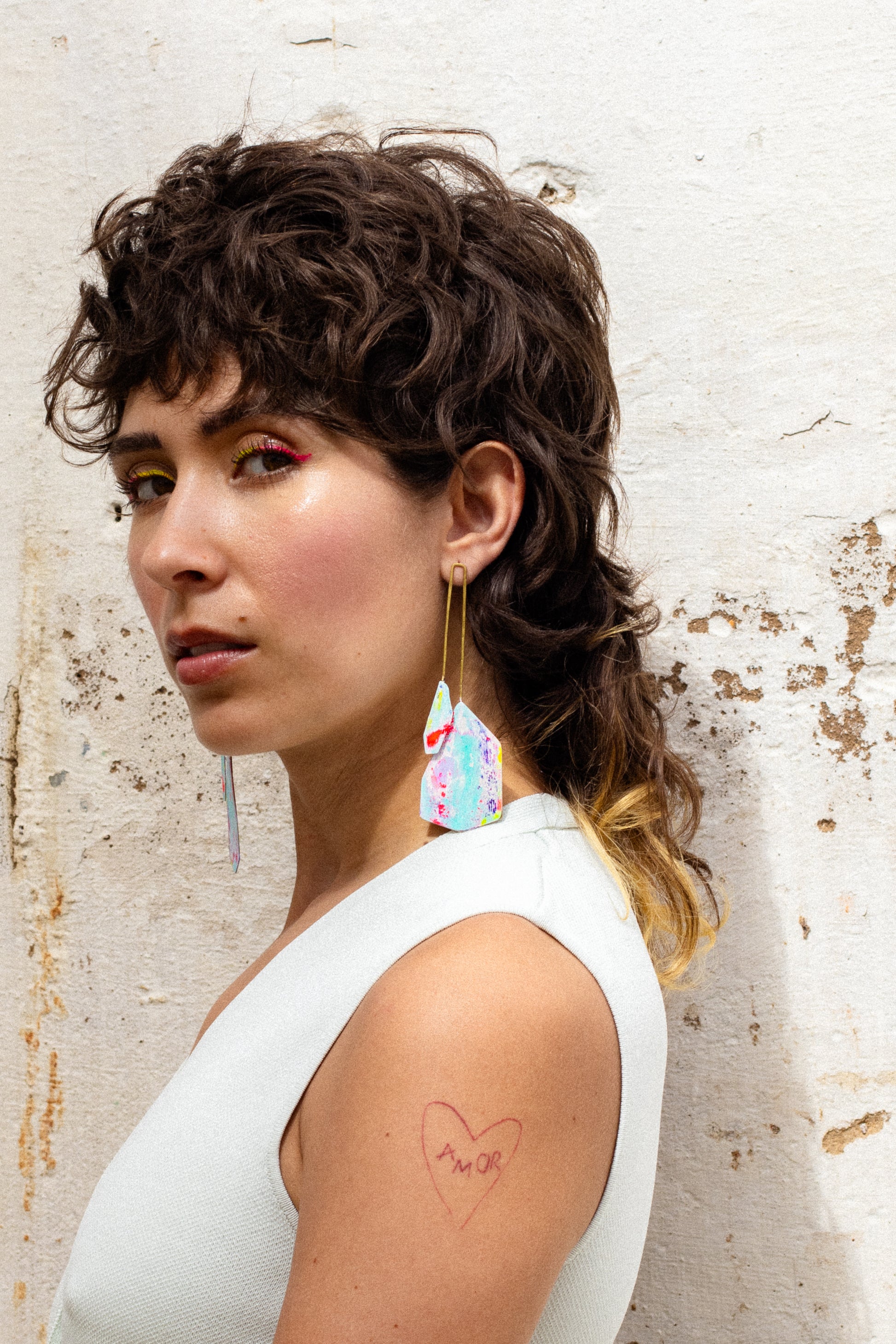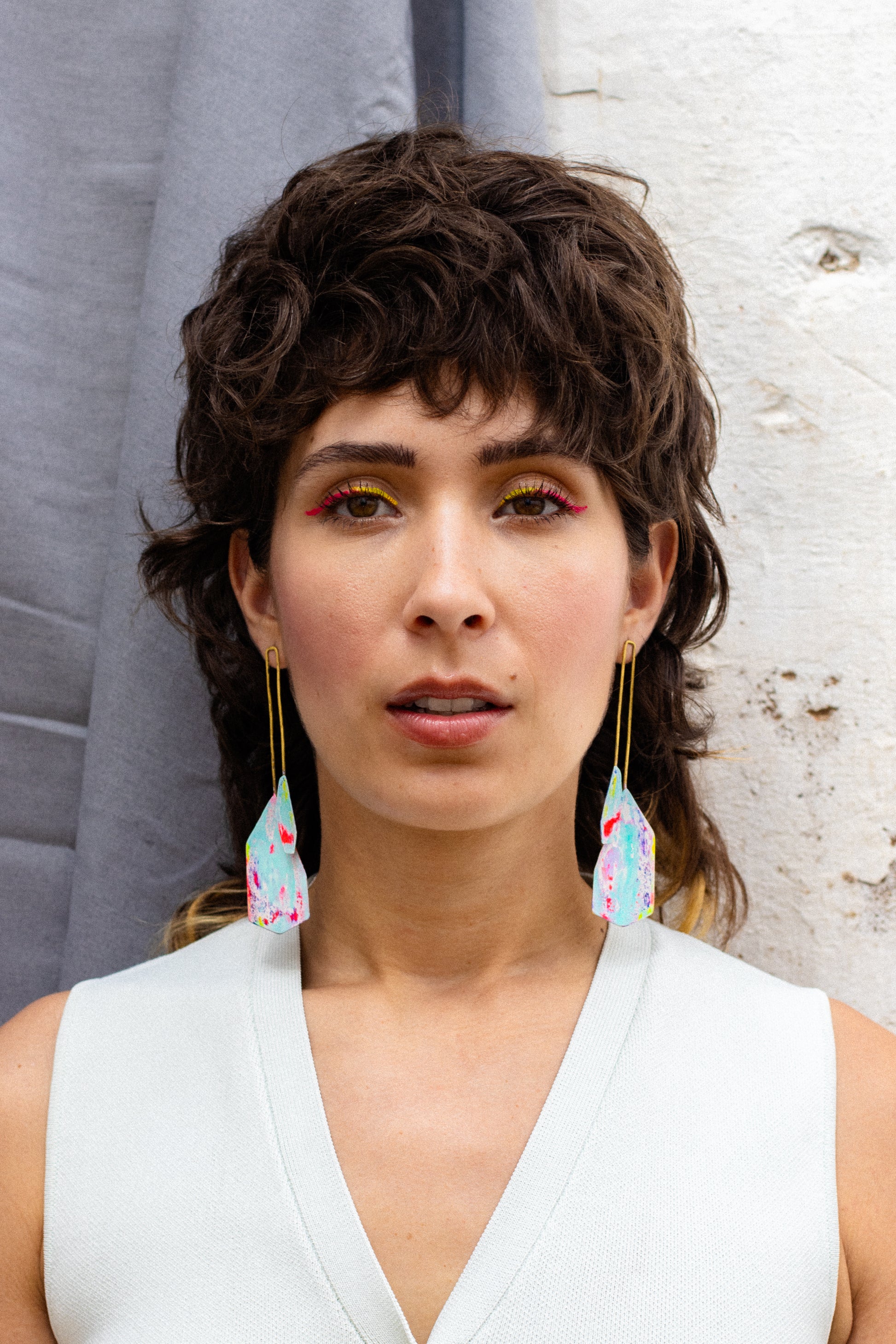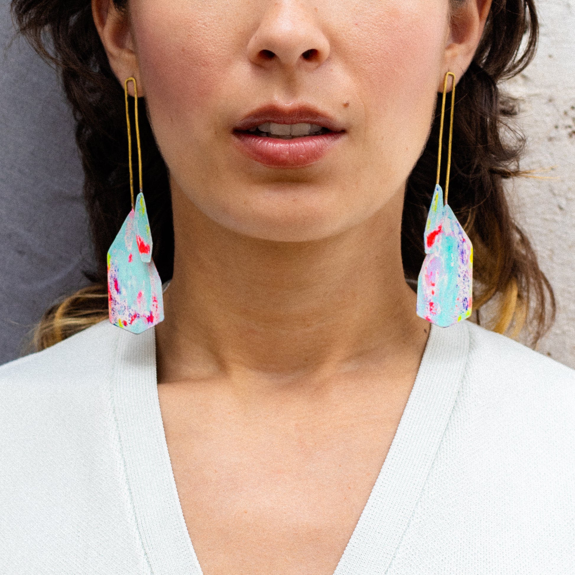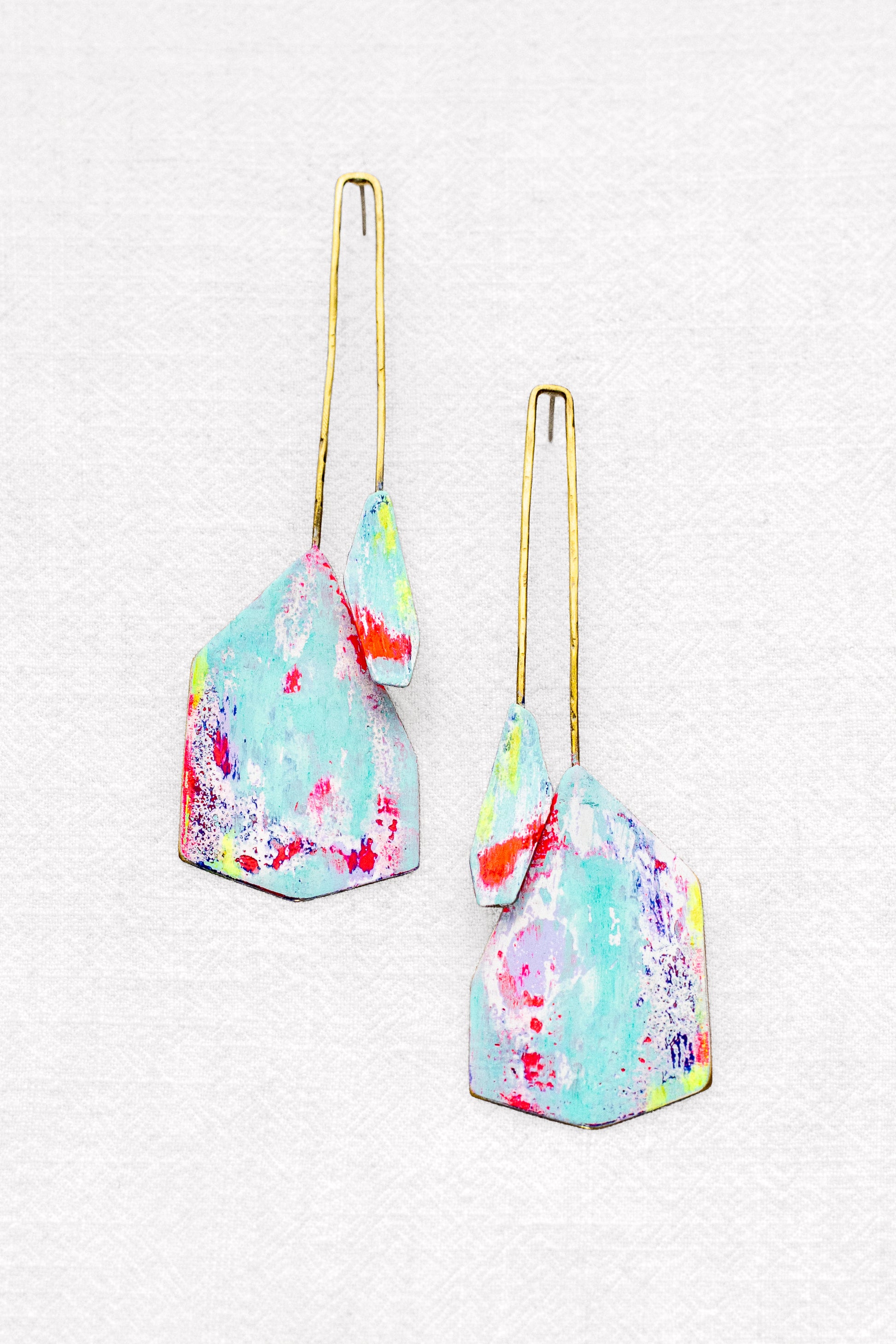 Pendiente de latón, perno y presión de plata. Pátina de pintura acrílica y pigmento. Capas superpuestas de diferentes colores.