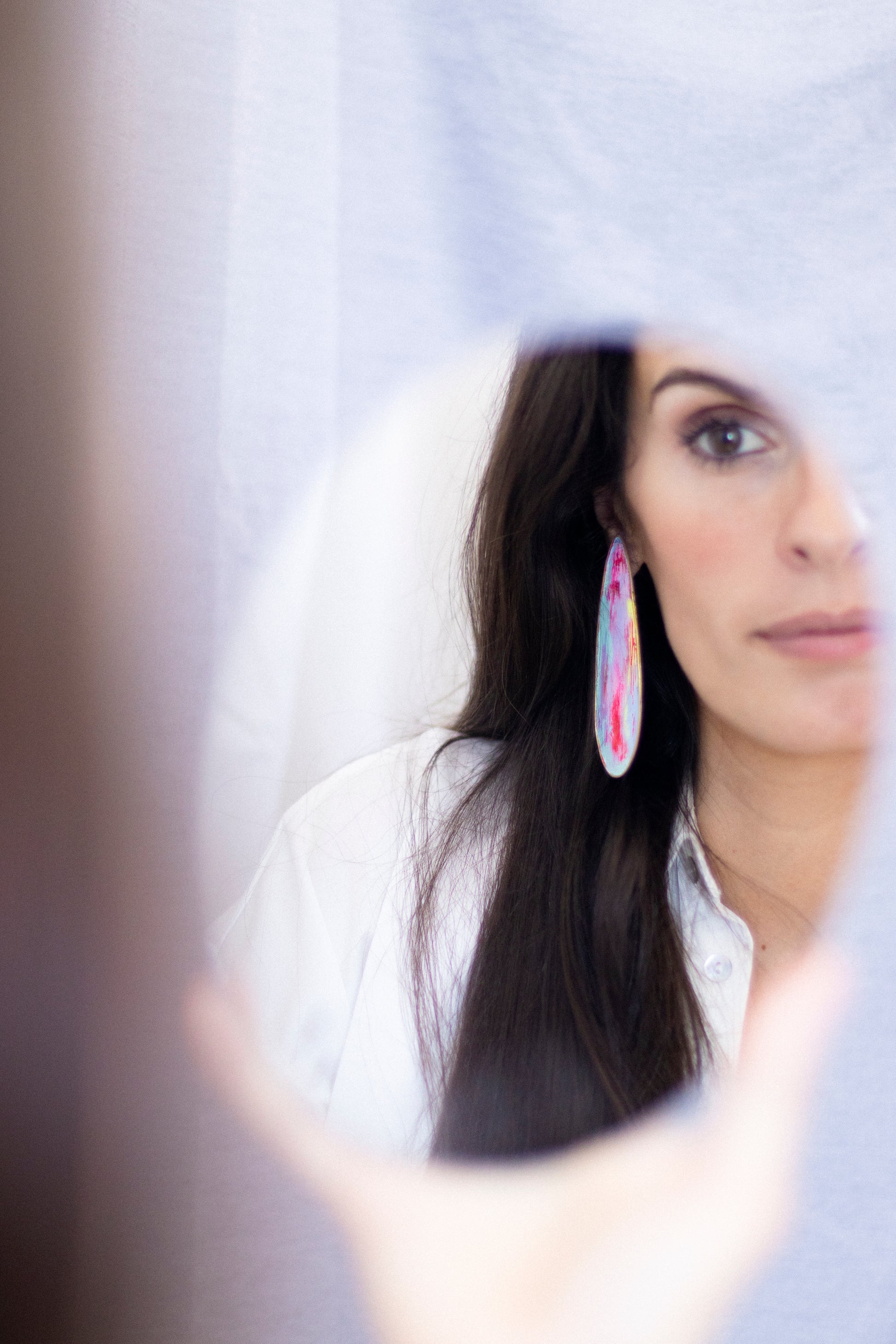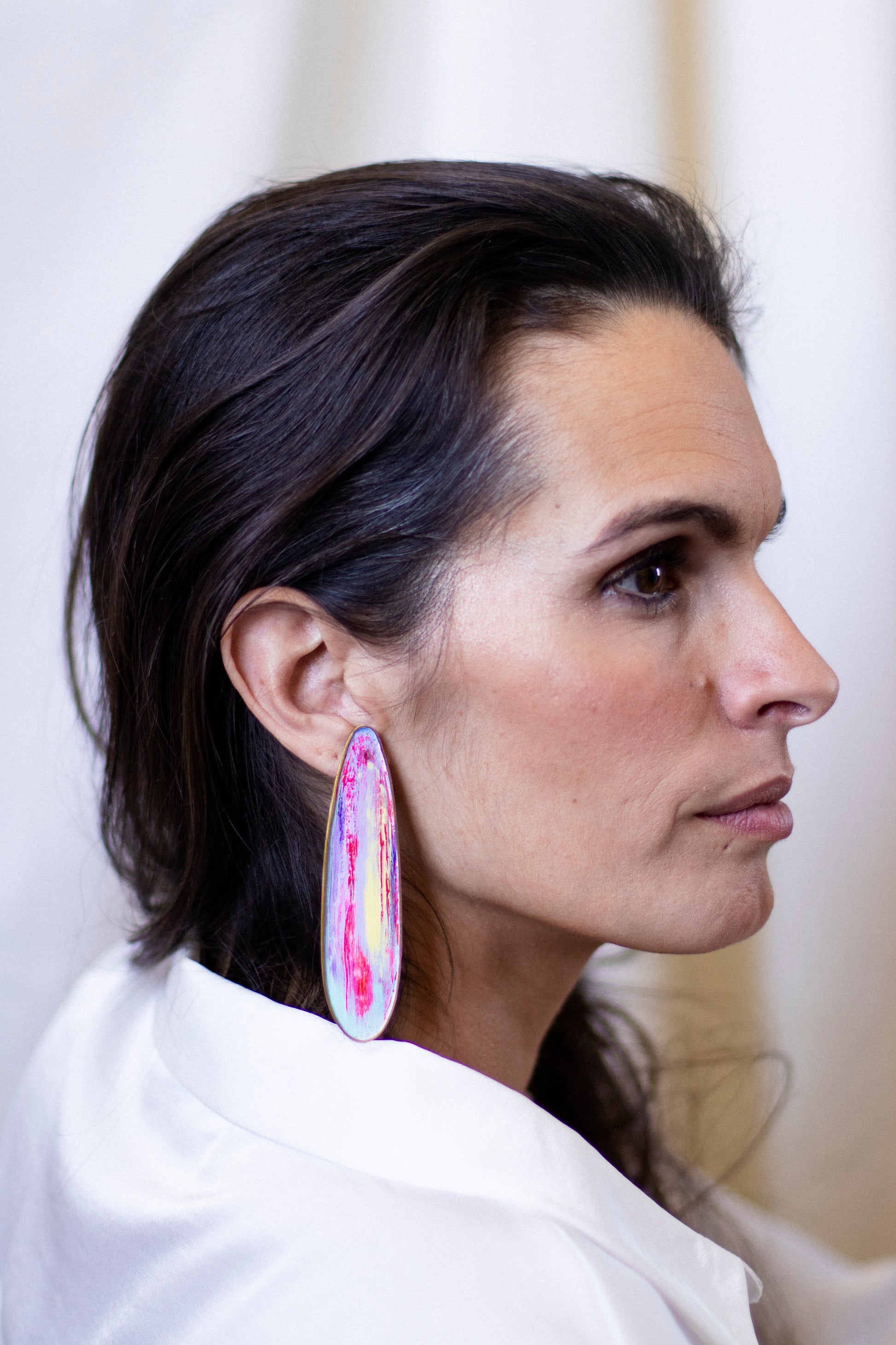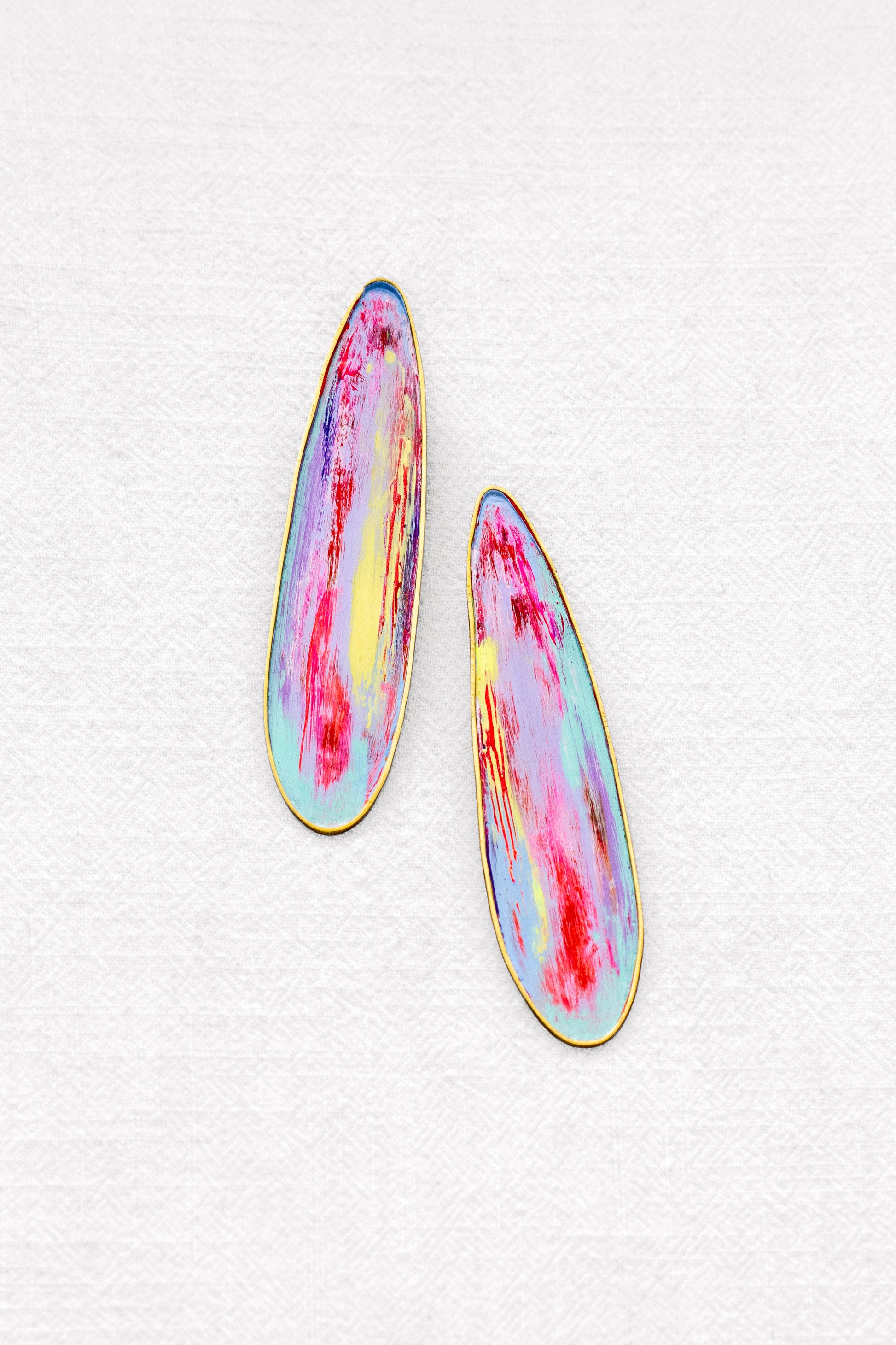Pendiente de latón, perno y presión de plata. Pátina de pintura acrílica y pigmento. Capas superpuestas de diferentes colores.