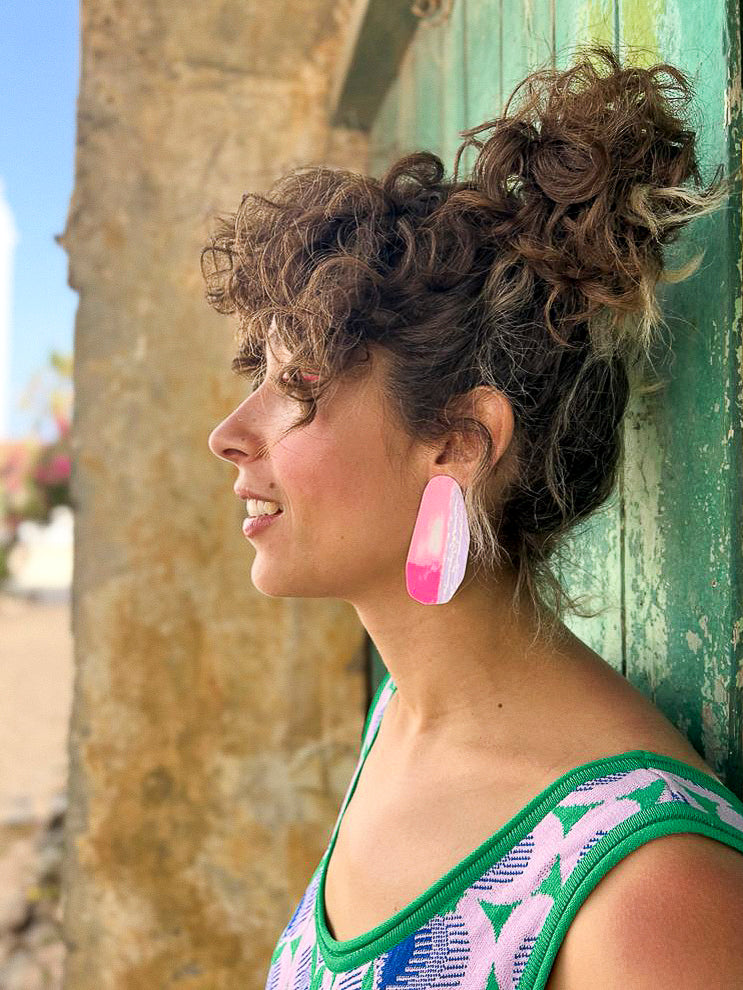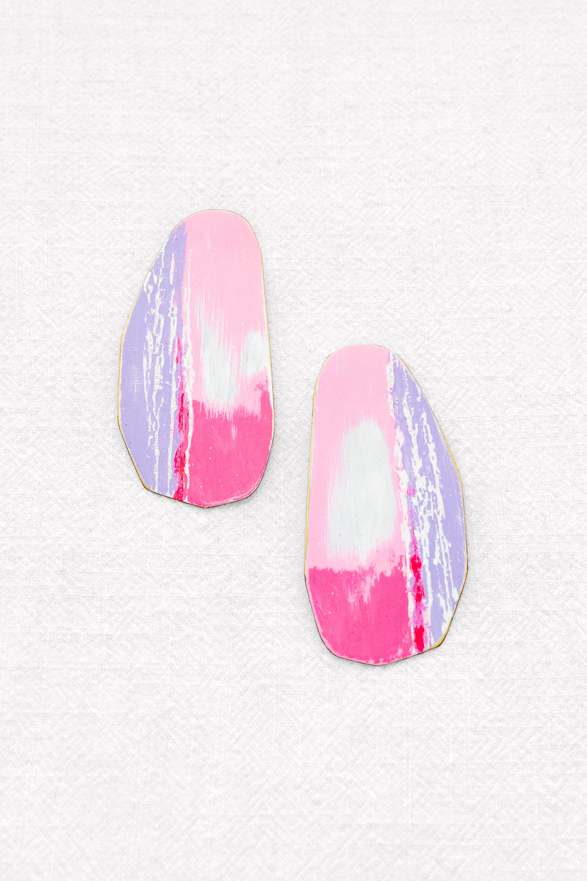 Pendiente de latón, perno y presión de plata. Pátina de pintura acrílica y pigmento. Capas superpuestas de diferentes colores.