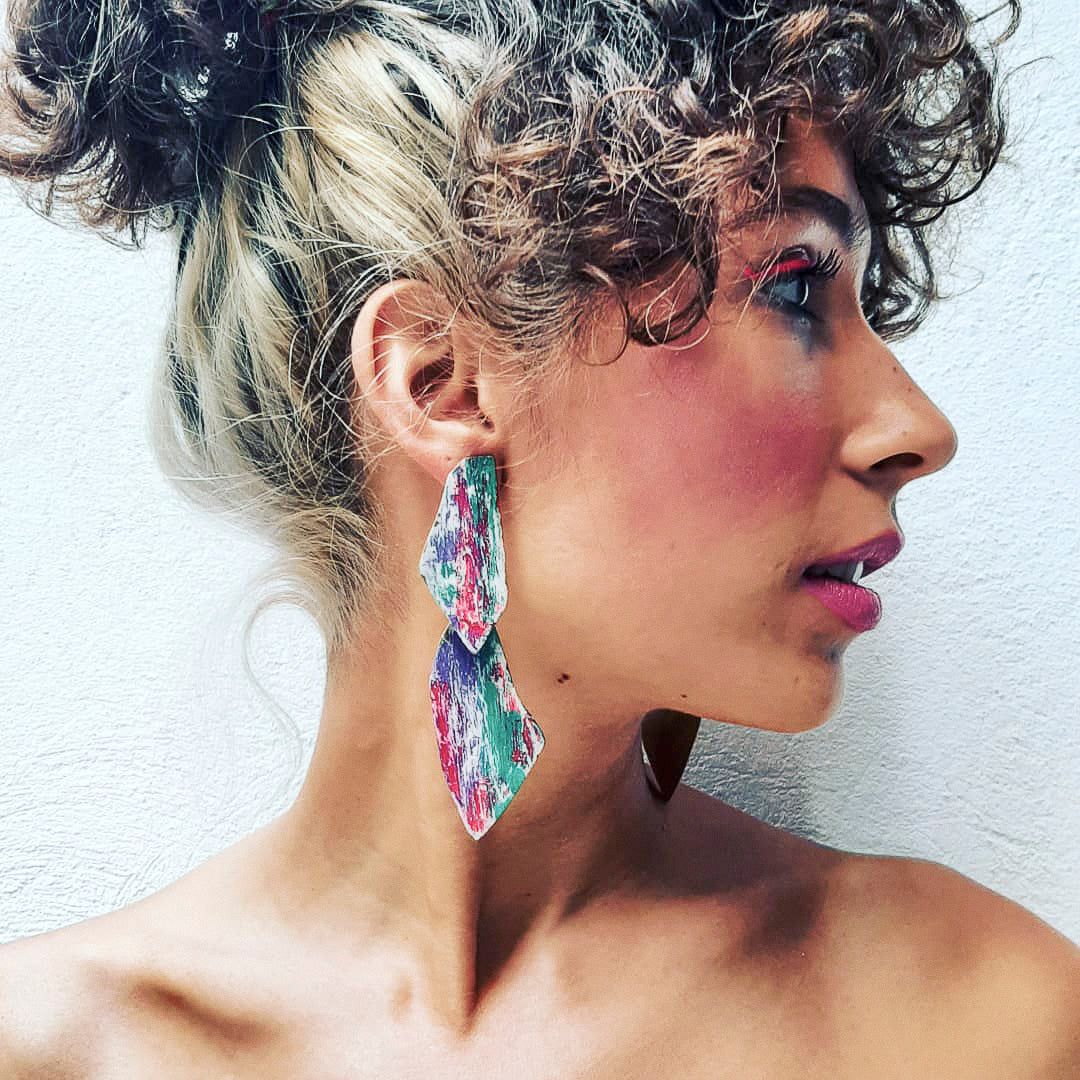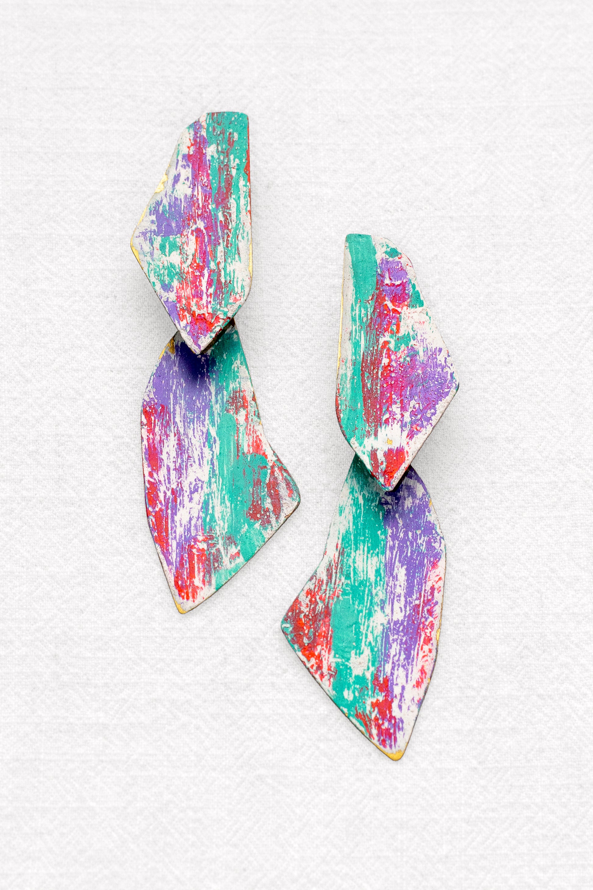 Pendiente de latón, perno y presión de plata. Pátina de pintura acrílica y pigmento. Capas superpuestas de diferentes colores.