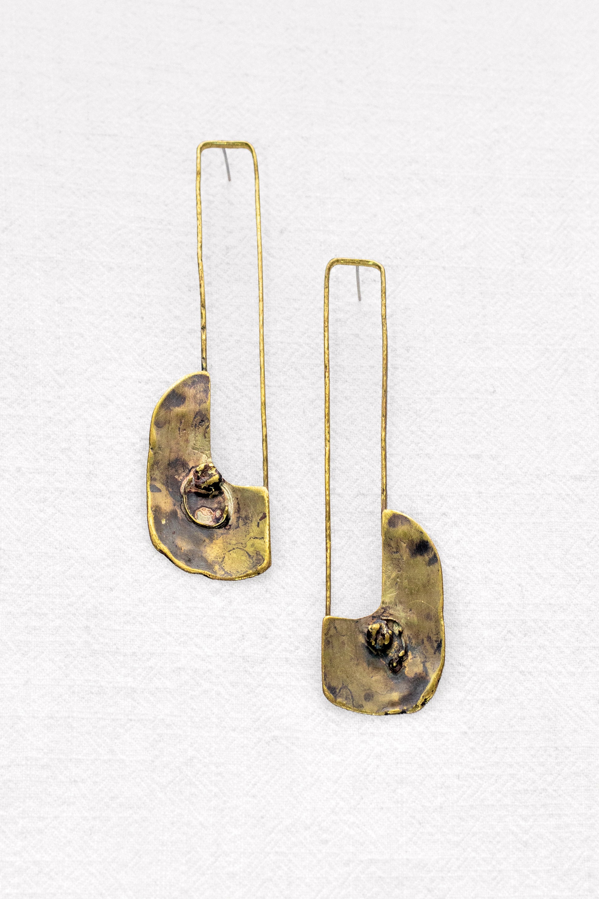 Pendiente de latón, perno y presión de plata. Pátina de óxido sobre metal.