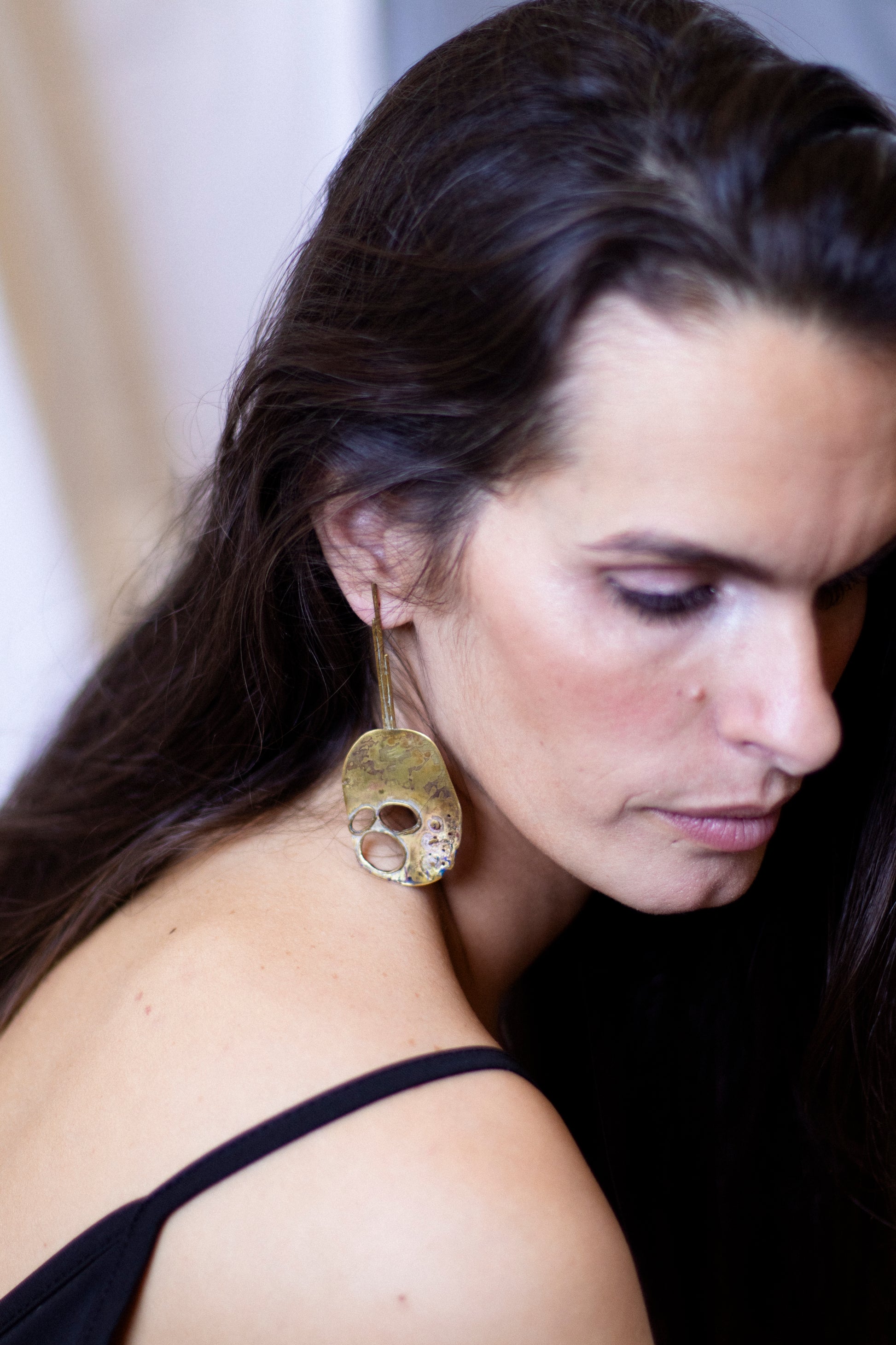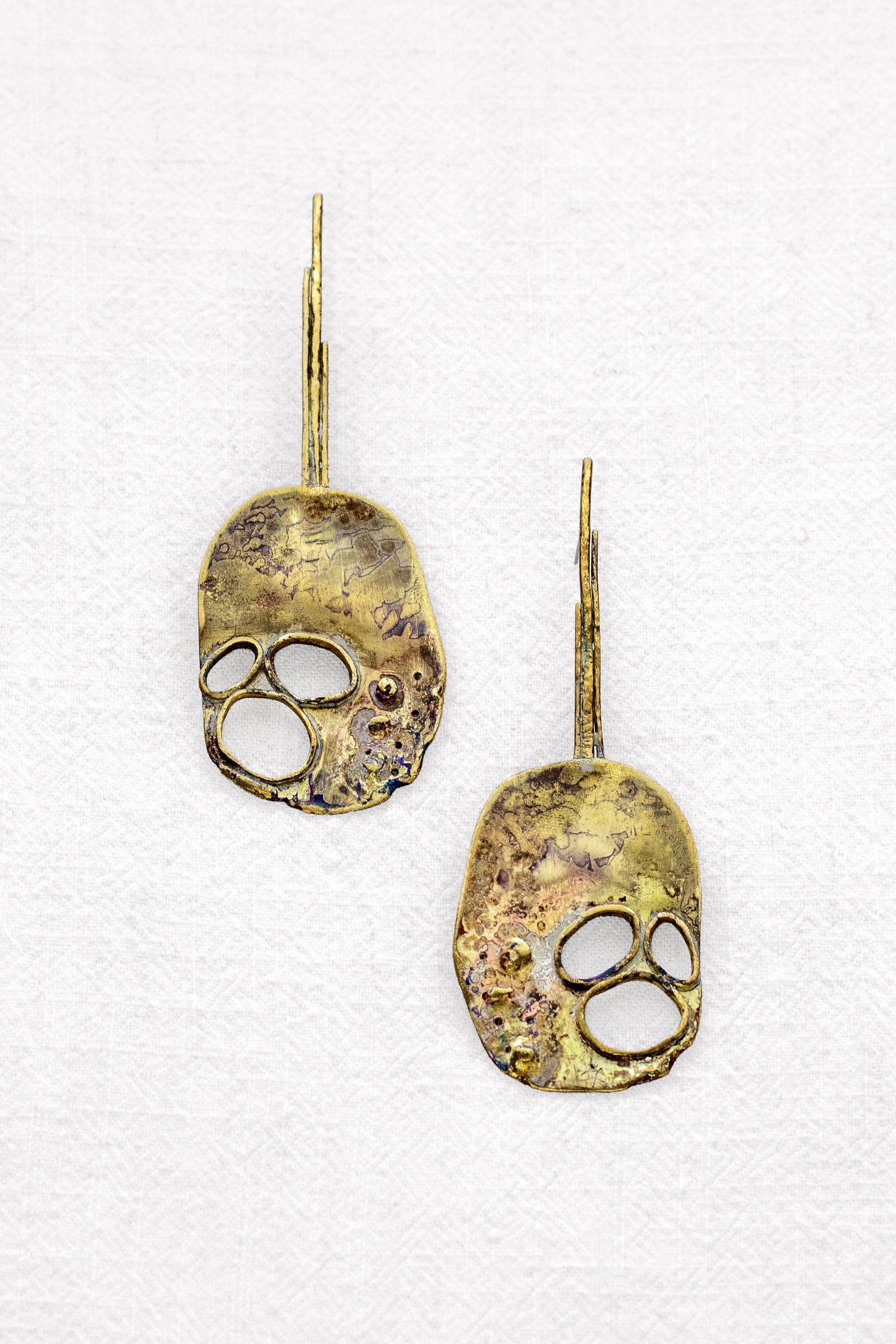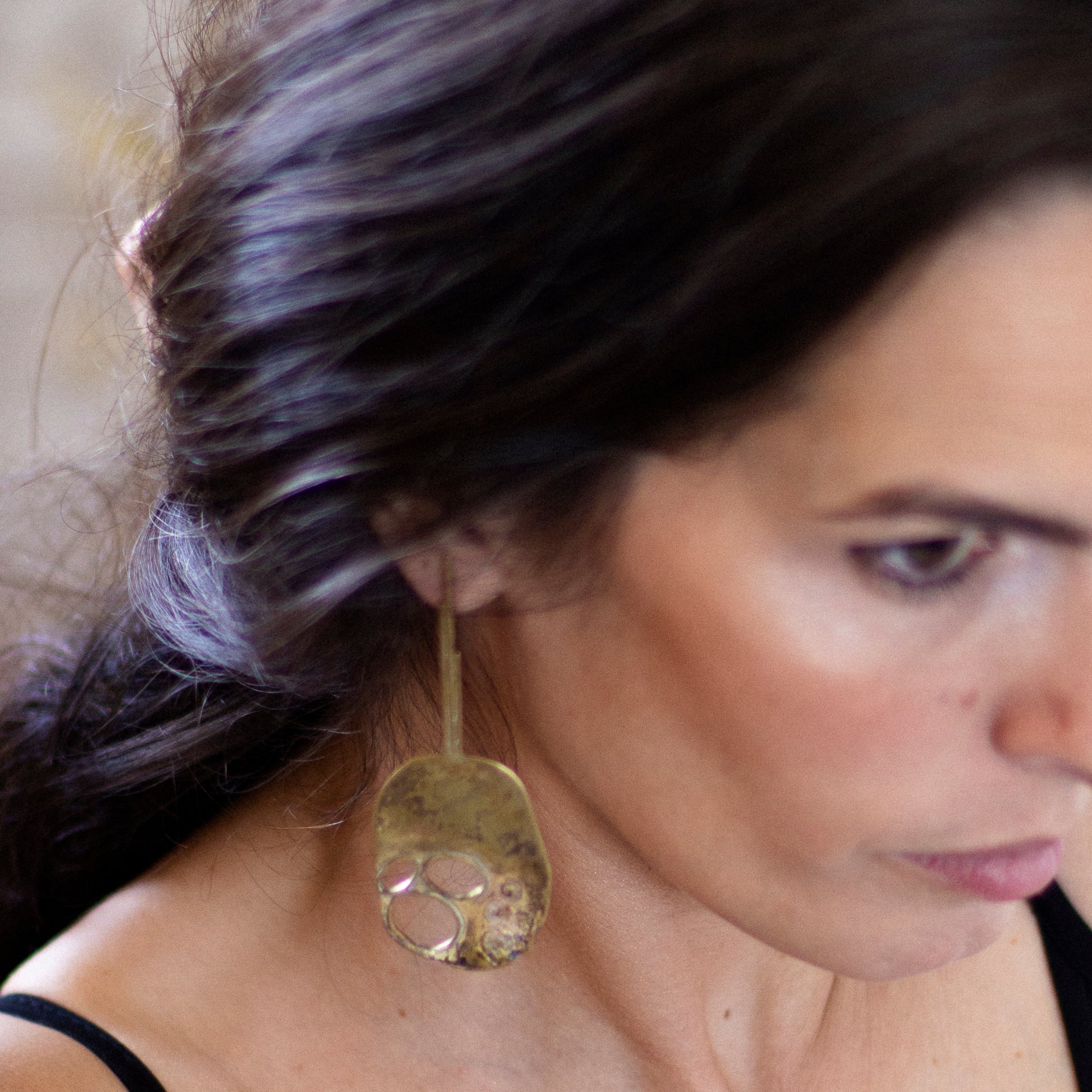 Pendiente de latón, perno y presión de plata. Pátina de óxido sobre metal.