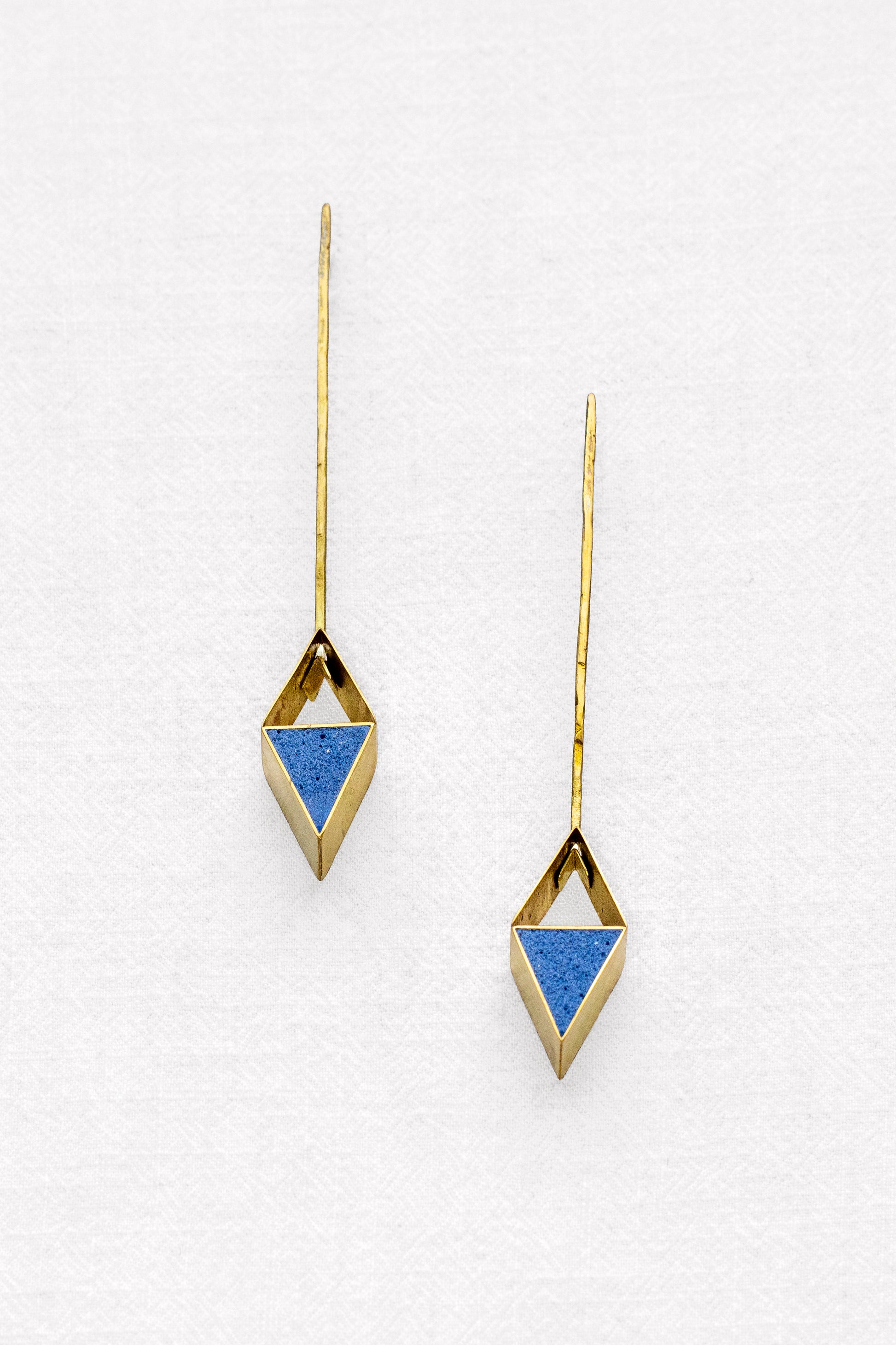 Pendiente de latón, perno y presión de plata. Cabujón con forma de rombo relleno en triángulo con cemento teñido en azul.