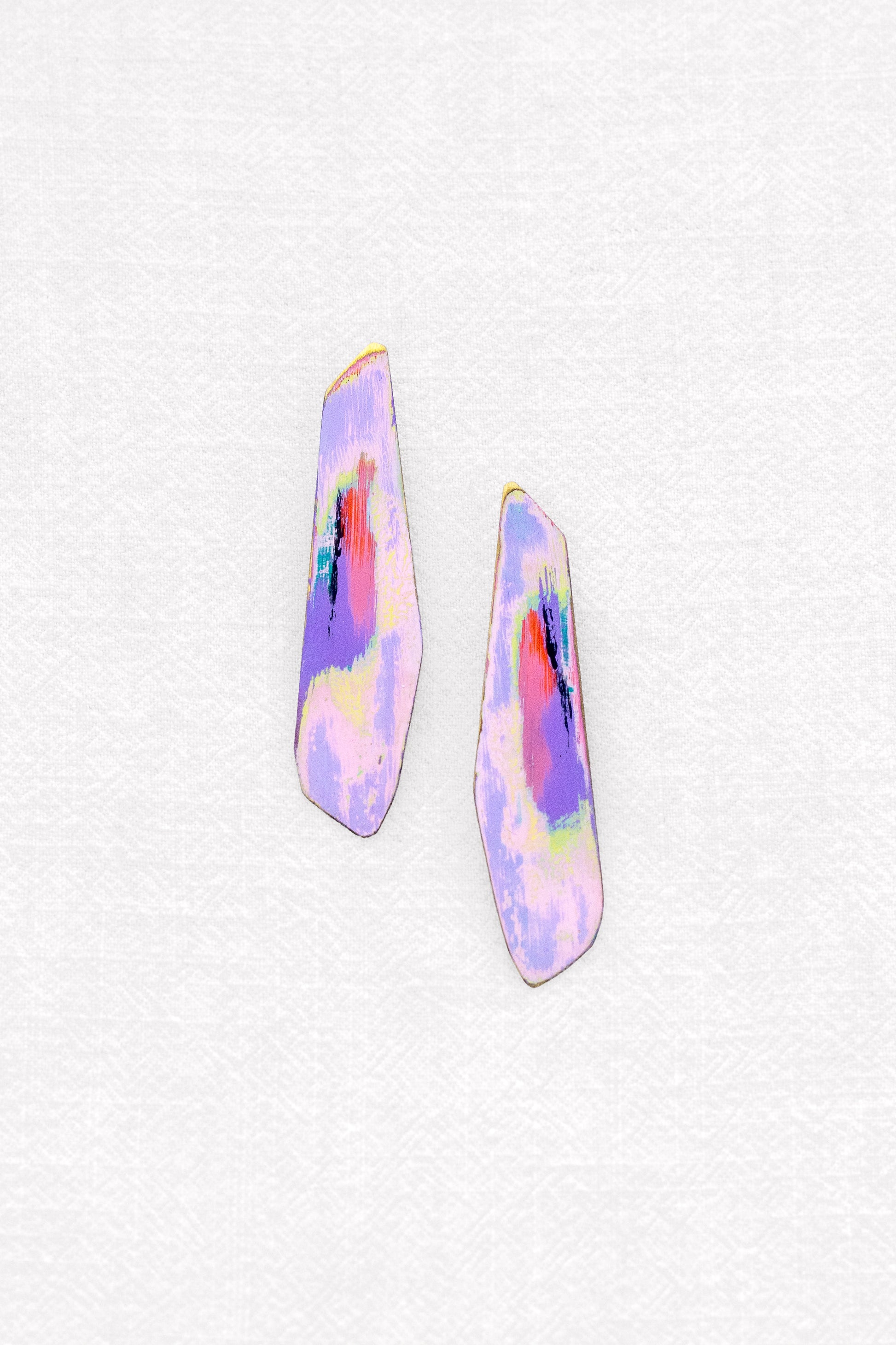 Pendiente de latón, perno y presión de plata. Pátina de pintura acrílica y pigmento. Capas superpuestas de diferentes colores.