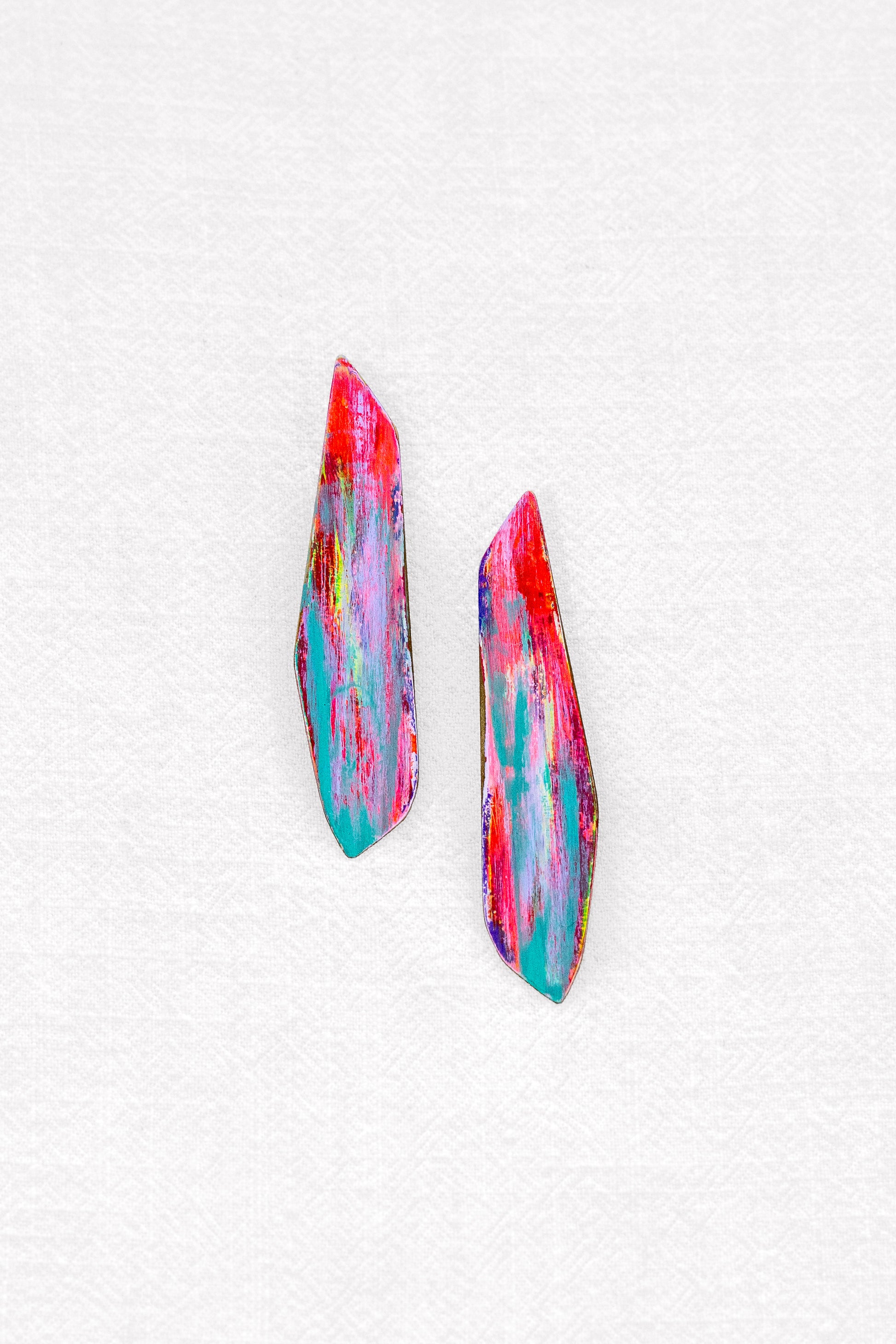 Pendiente de latón, perno y presión de plata. Pátina de pintura acrílica y pigmento. Capas superpuestas de diferentes colores.