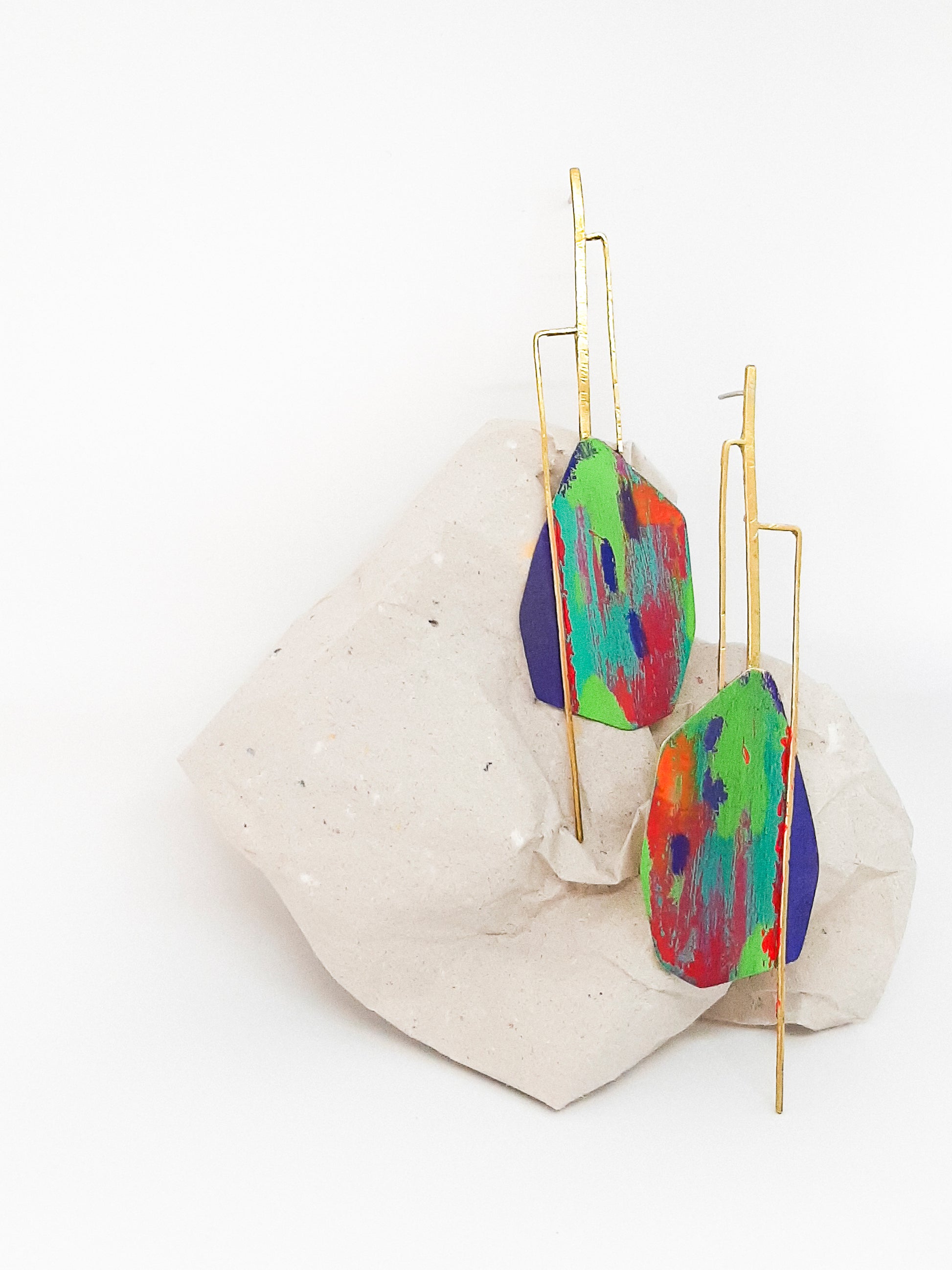 Pendiente de latón, perno y presión de plata. Pátina de pintura acrílica y pigmento. Capas superpuestas de diferentes colores.