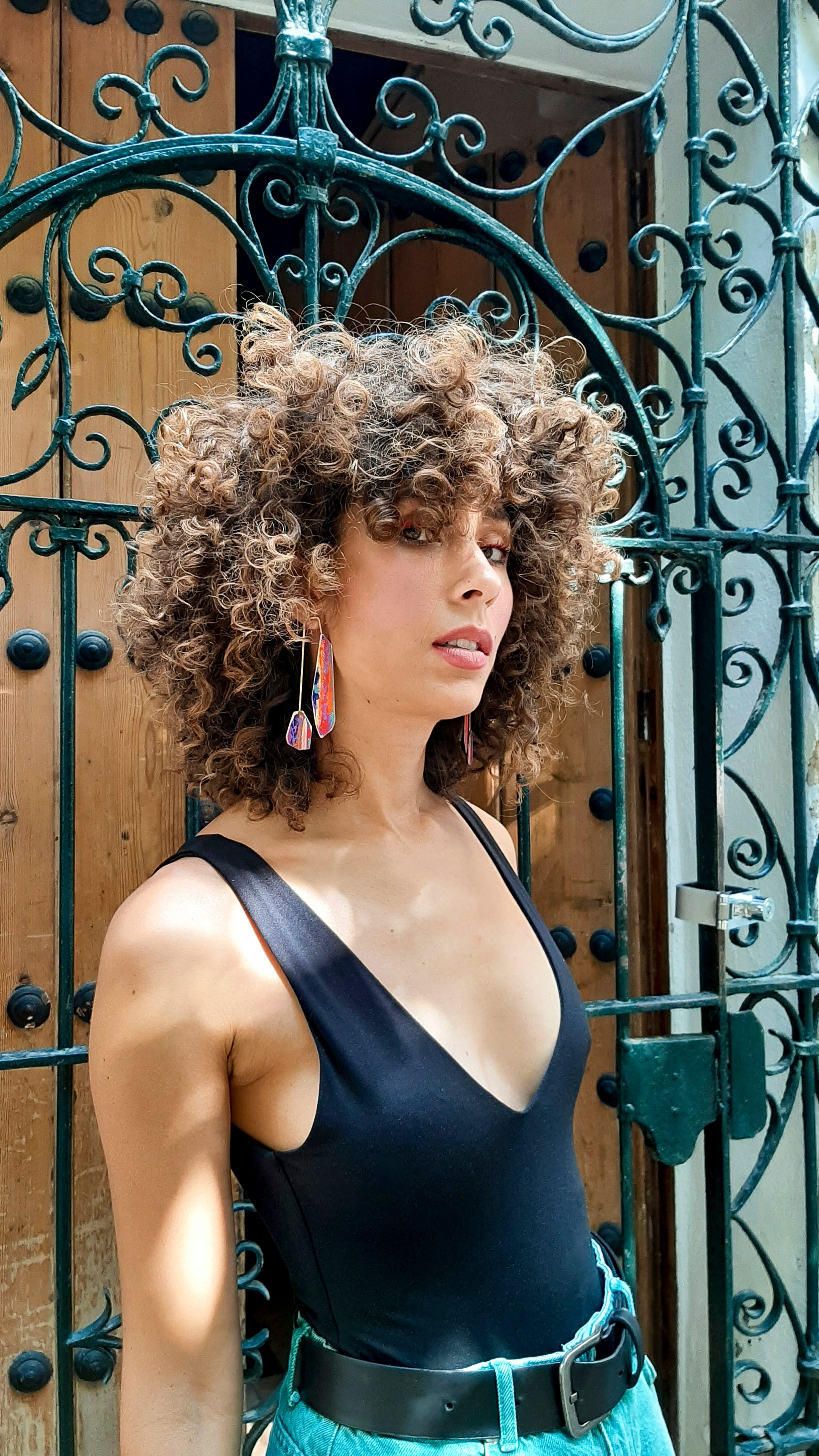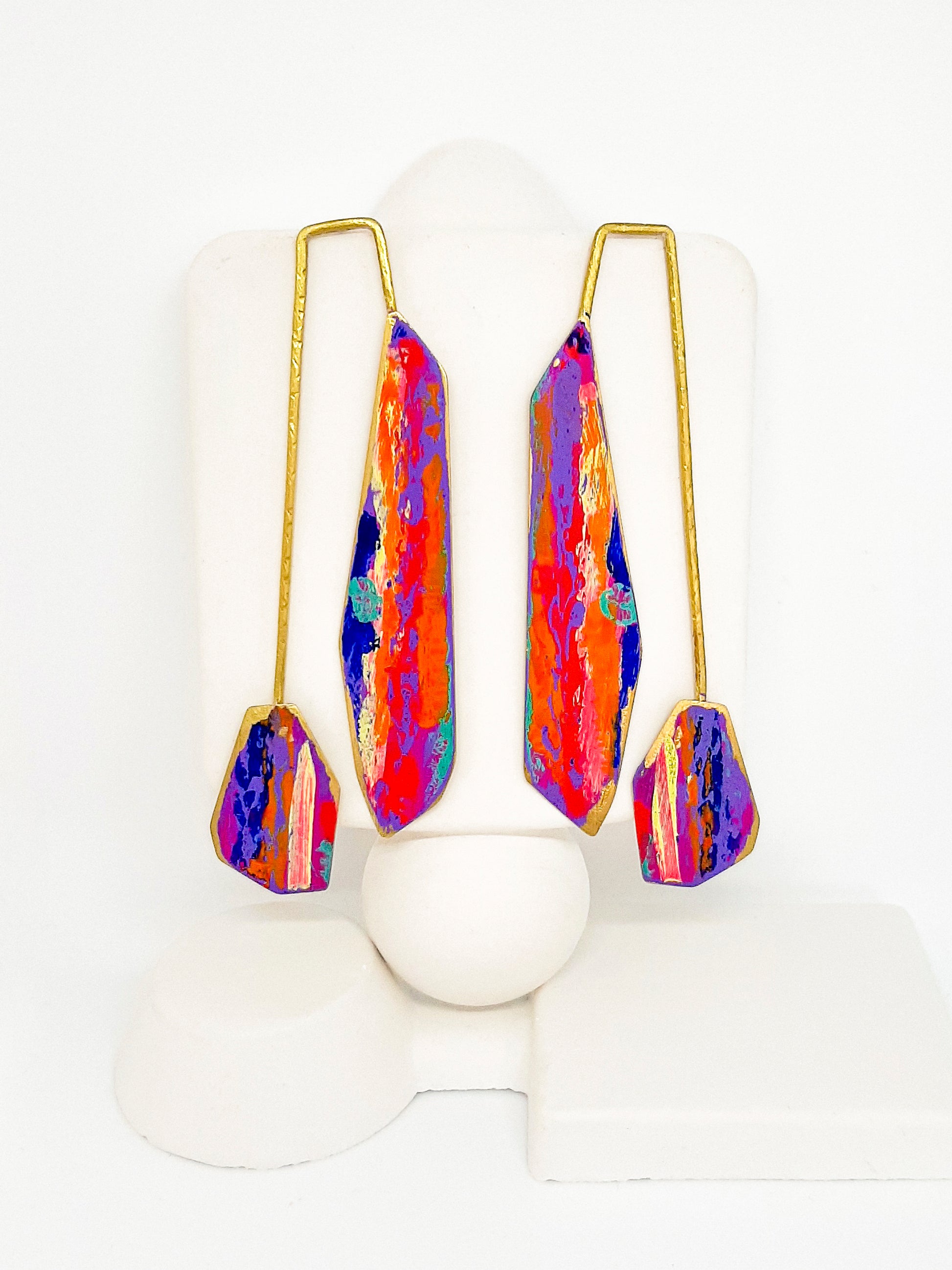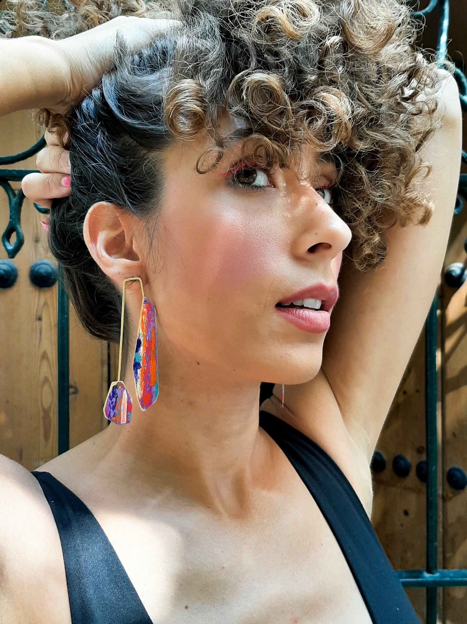 Pendiente de latón, perno y presión de plata. Pátina de pintura acrílica y pigmento. Capas superpuestas de diferentes colores.