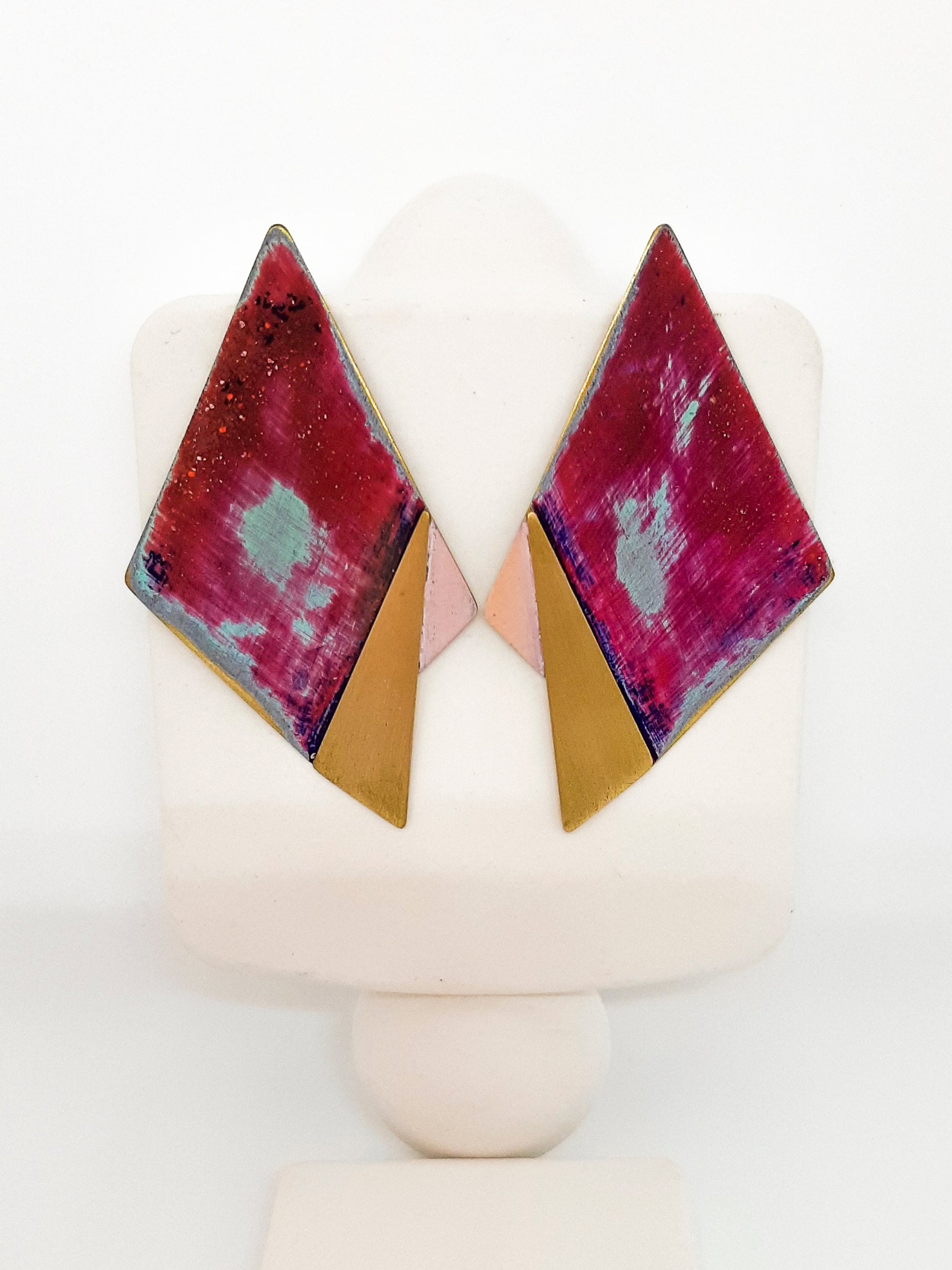 Pendiente de latón, perno y presión de plata. Pátina de pintura acrílica y pigmento. Capas superpuestas de diferentes colores.