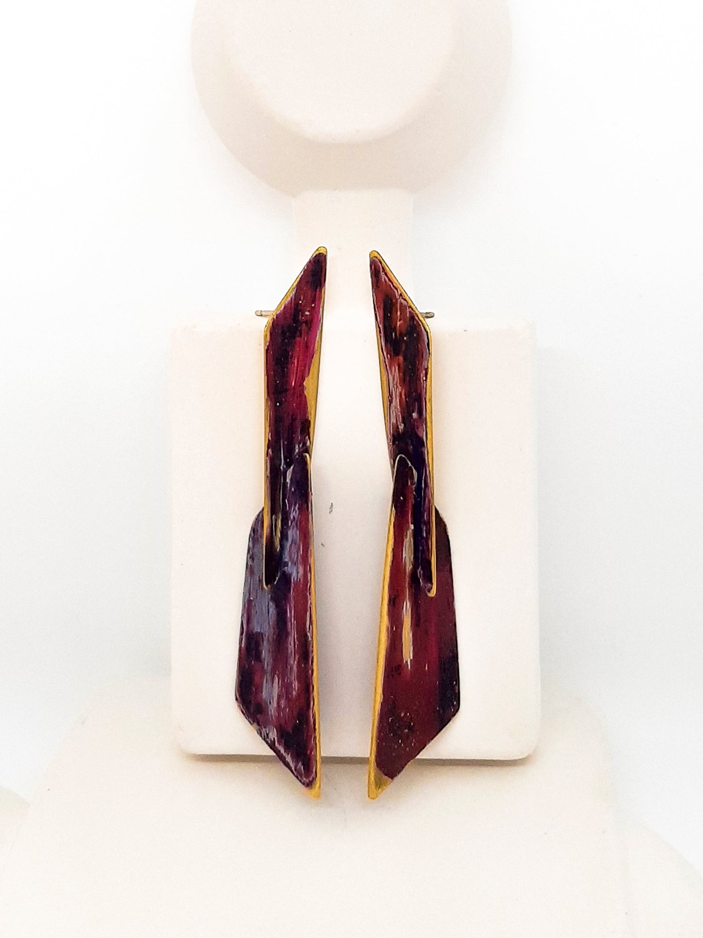Pendiente de latón, perno y presión de plata. Pátina de pintura acrílica y pigmento. Capas superpuestas de diferentes colores.