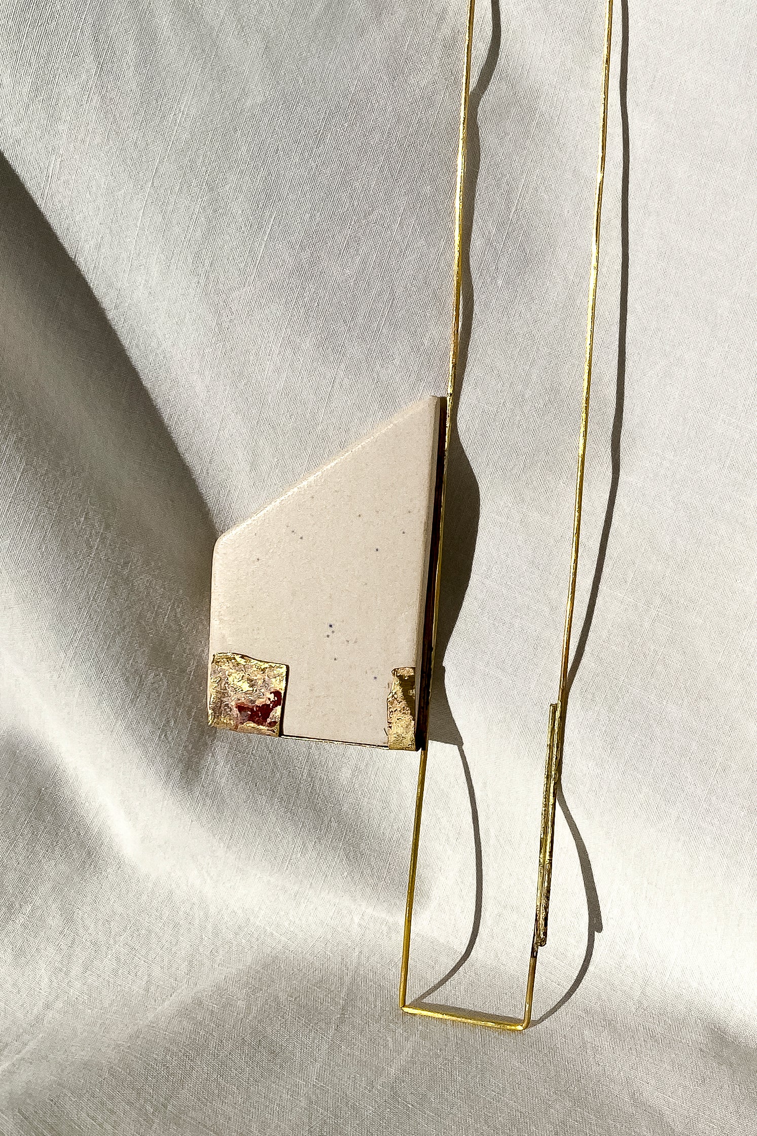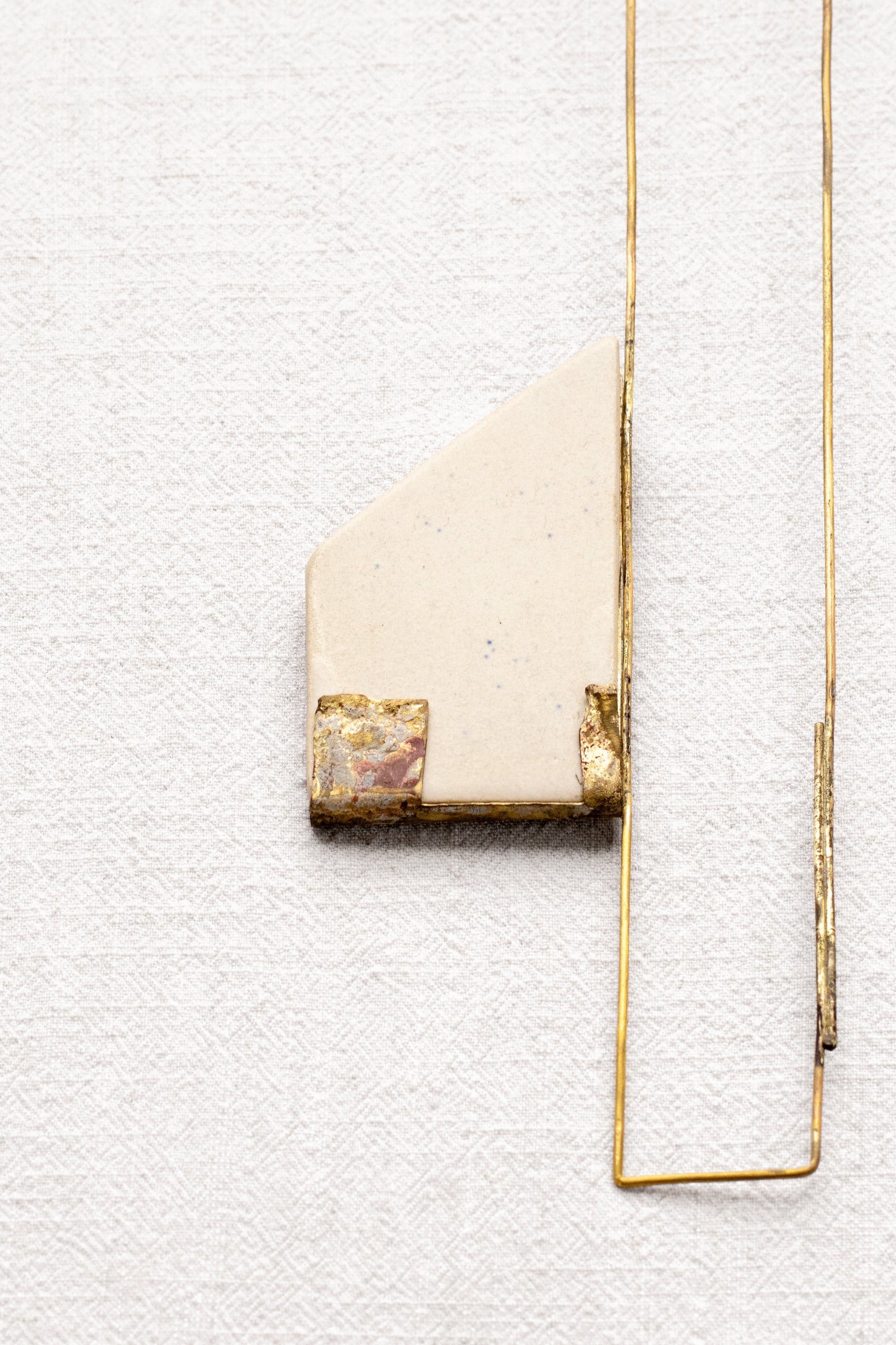 Pieza para colgar en pared. Cerámica esmaltad de alta temperatura y estructura de latón con pátina de óxido.