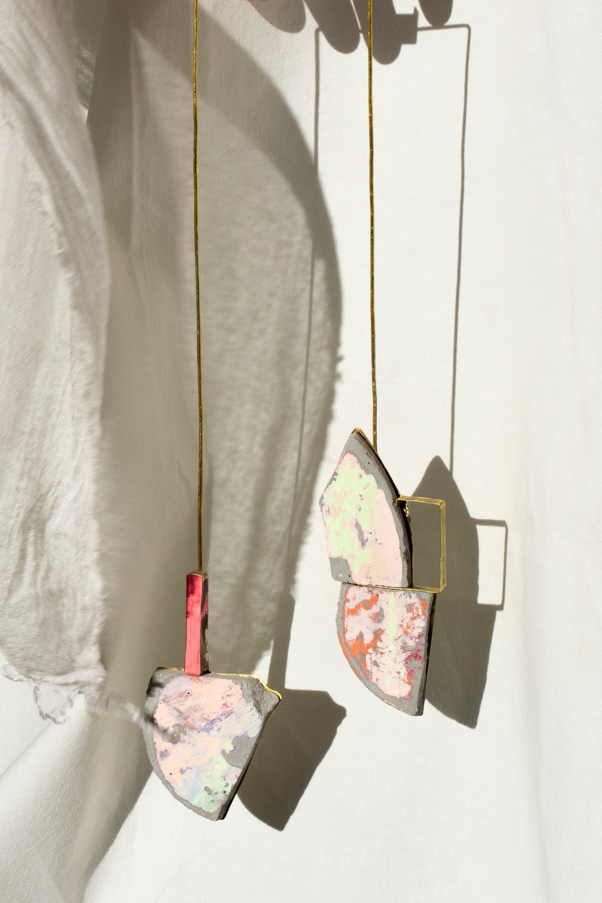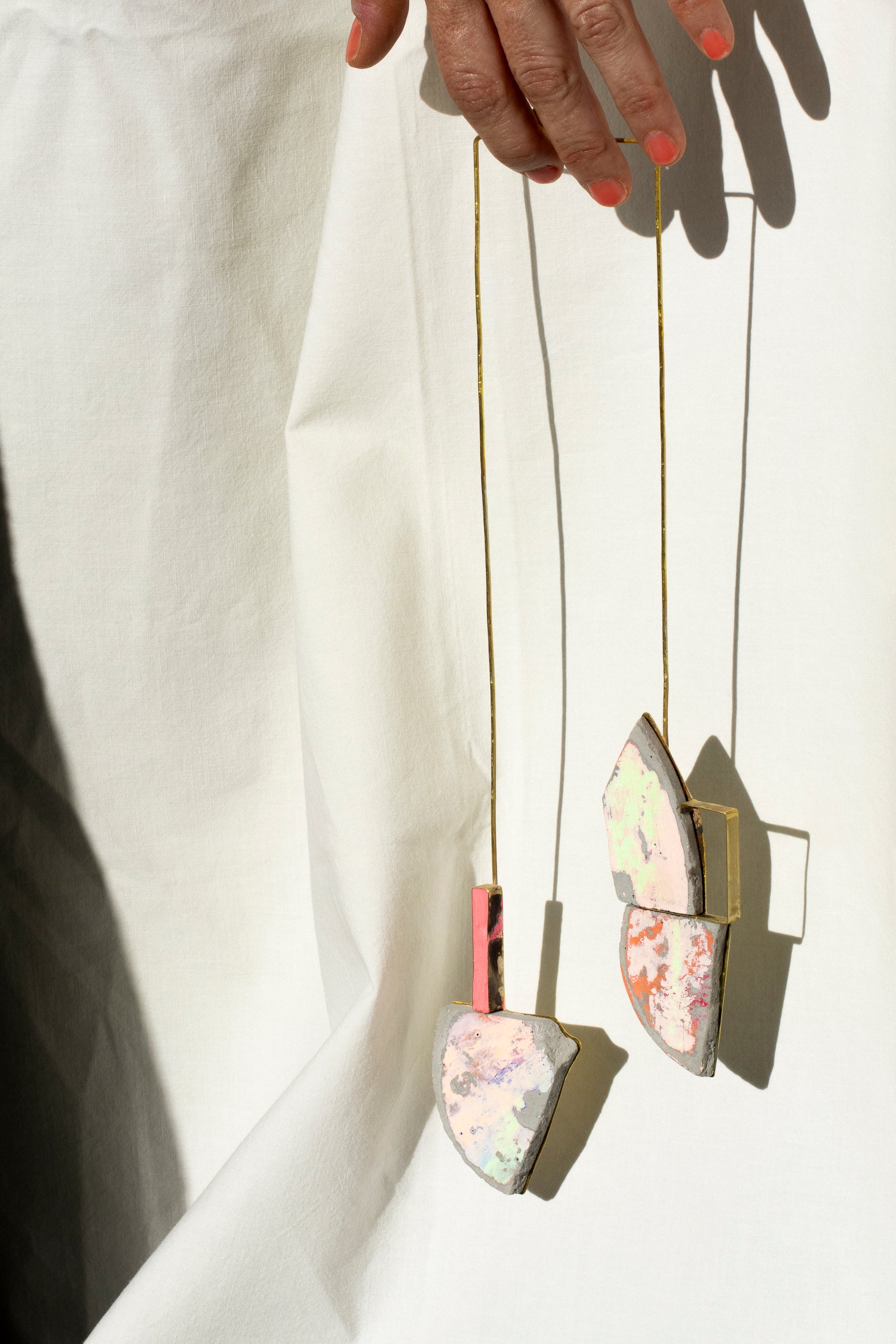 Pieza para colgar. Cemento con pátinas de acrílico en varios colores. Estructura de latón.